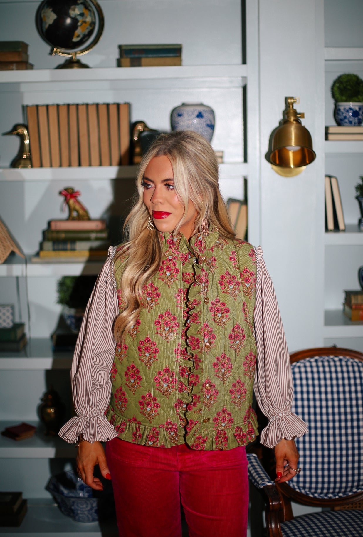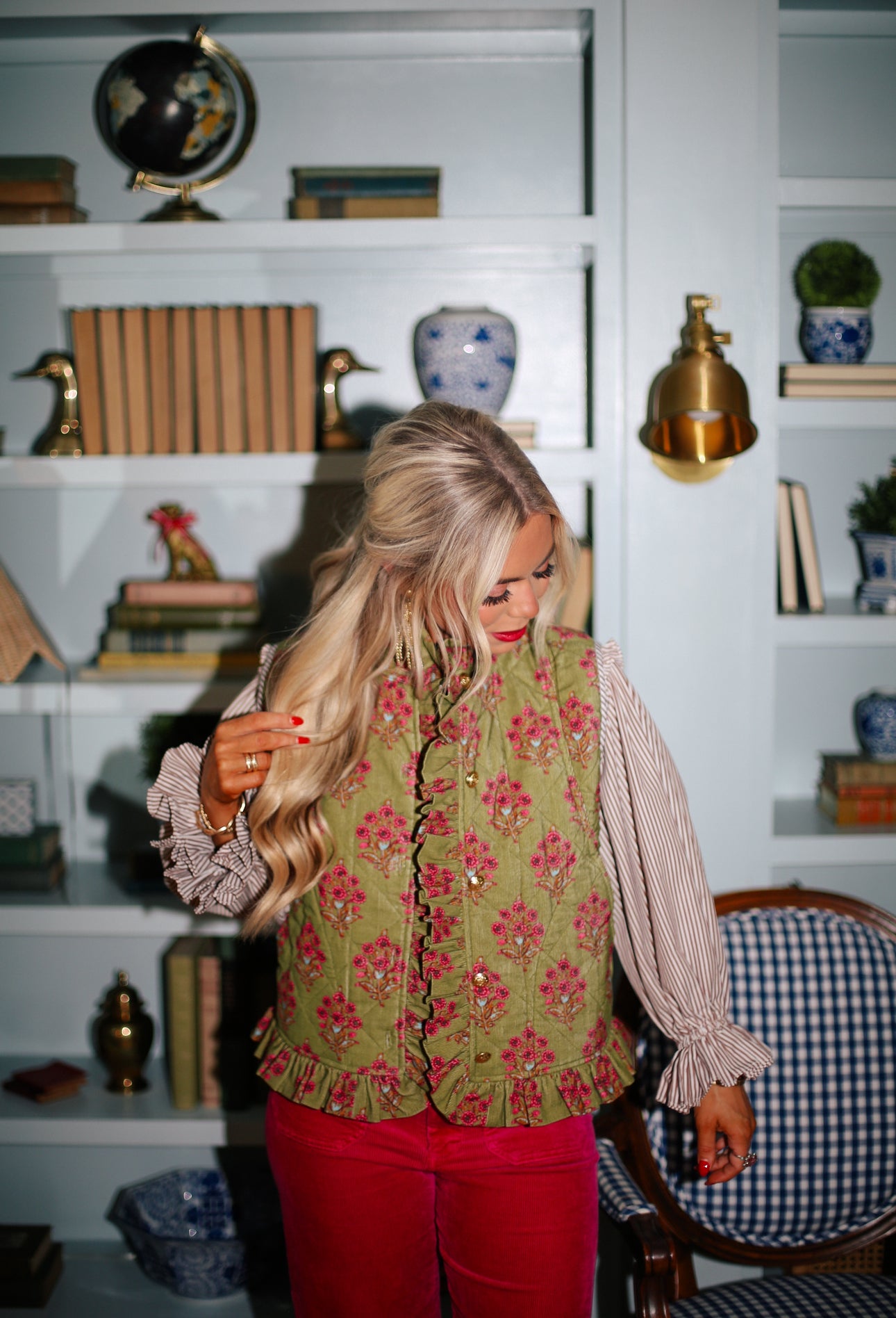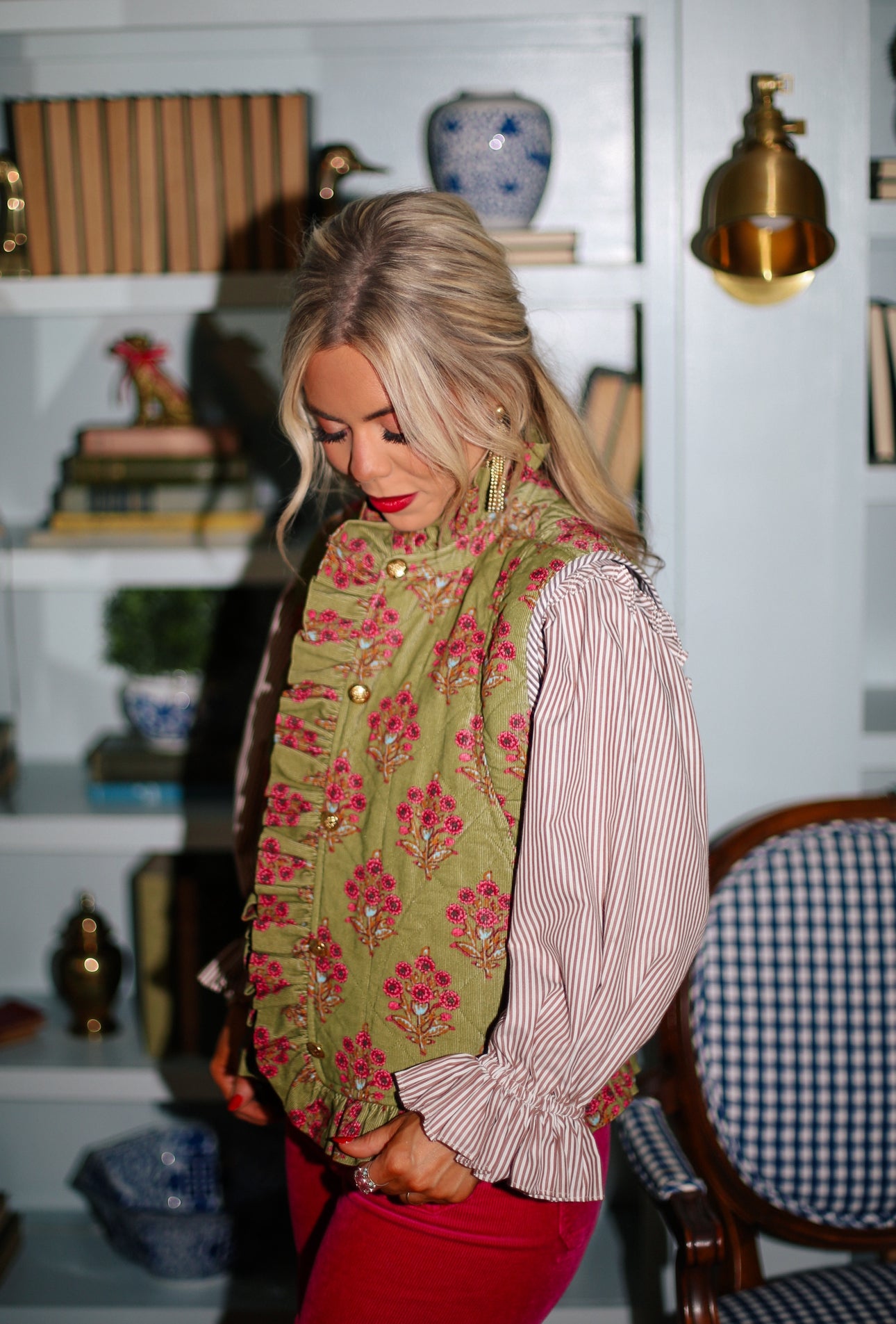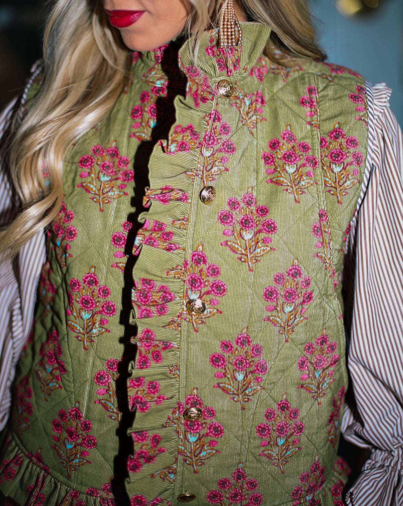 Olive corduroy, ruffle detailing, stripe piping and lining, and brass buttons? Yes please! Bringing back our best-selling vest design, the Vivienne vest, now in olive corduory! This ruffled number is super cozy and comfortable, and is the ideal statement piece to layer over all of your favorite EWD tops! Featuring quilted corduroy fabric, beautiful brass buttons and side pockets!