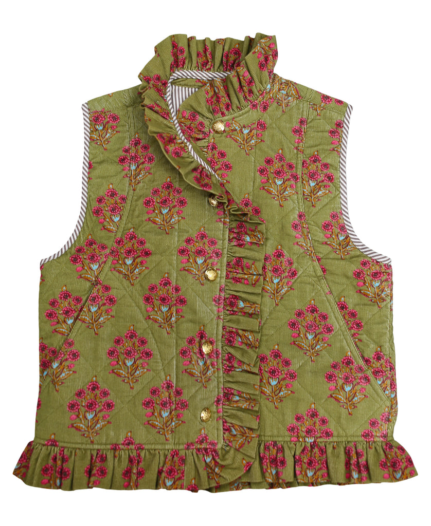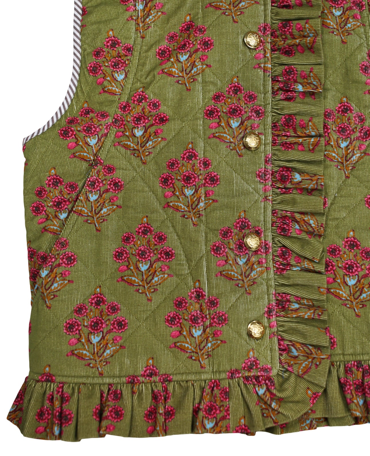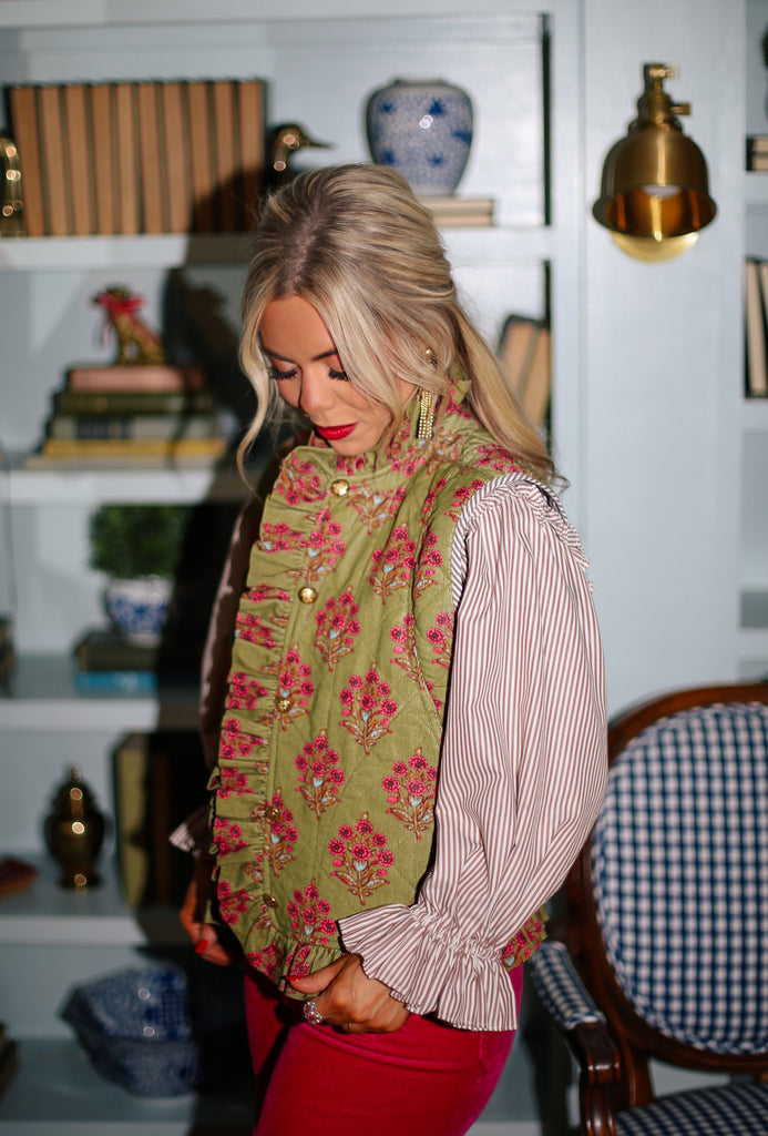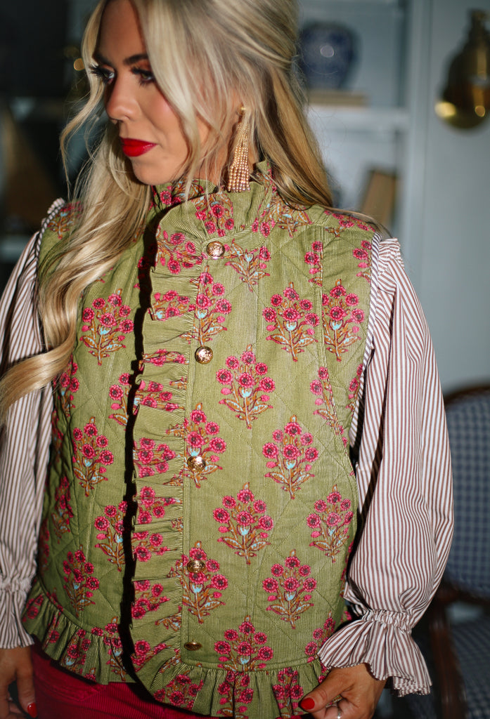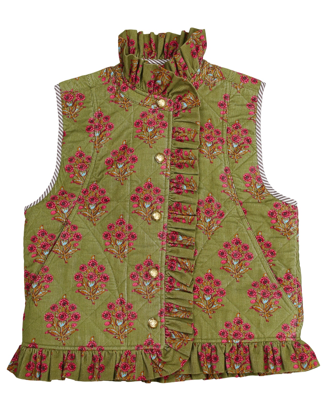 Olive corduroy, ruffle detailing, stripe piping and lining, and brass buttons? Yes please! Bringing back our best-selling vest design, the Vivienne vest, now in olive corduory! This ruffled number is super cozy and comfortable, and is the ideal statement piece to layer over all of your favorite EWD tops! Featuring quilted corduroy fabric, beautiful brass buttons and side pockets!