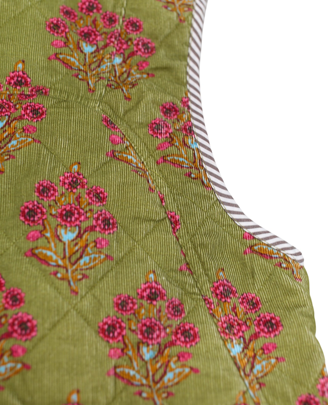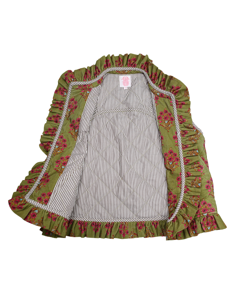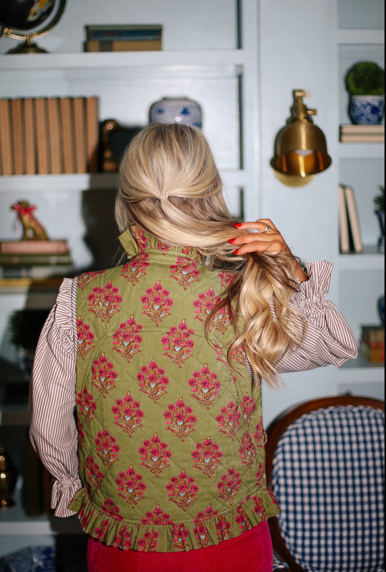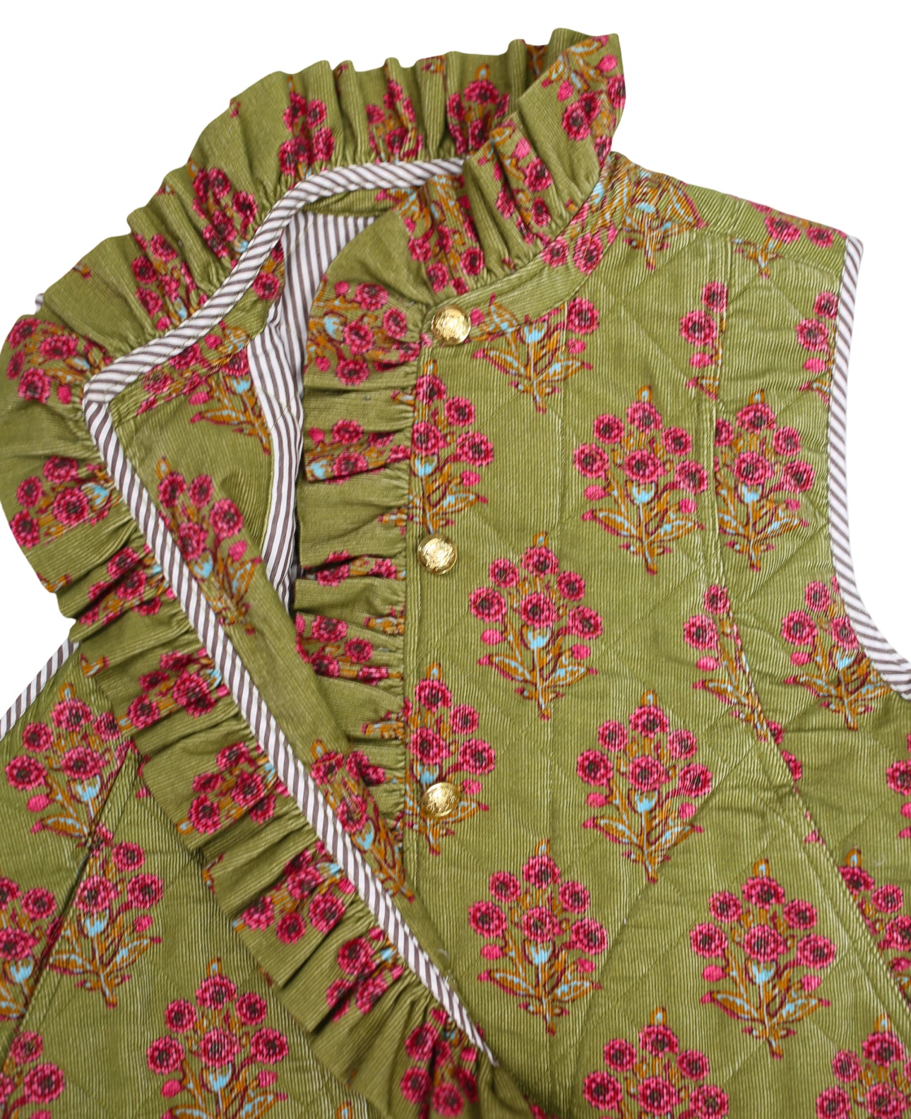 Olive corduroy, ruffle detailing, stripe piping and lining, and brass buttons? Yes please! Bringing back our best-selling vest design, the Vivienne vest, now in olive corduory! This ruffled number is super cozy and comfortable, and is the ideal statement piece to layer over all of your favorite EWD tops! Featuring quilted corduroy fabric, beautiful brass buttons and side pockets!