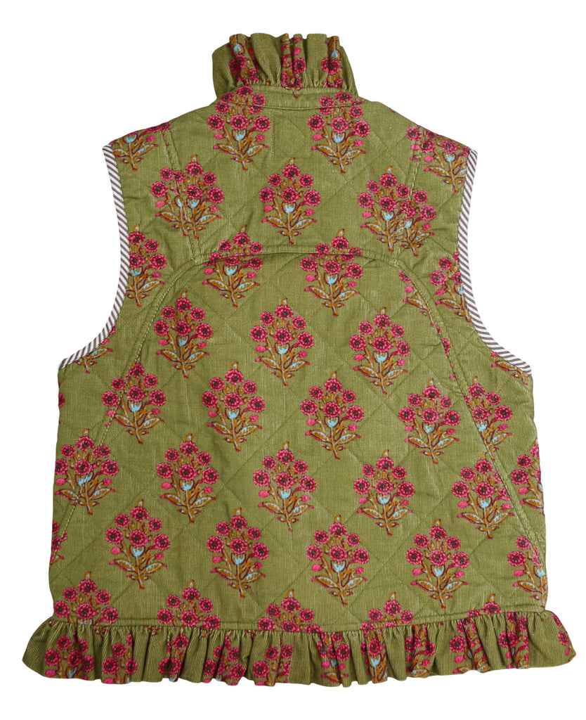 A fully-lined vest with stripe piping and ruffle detailing around the neckline and down the front.