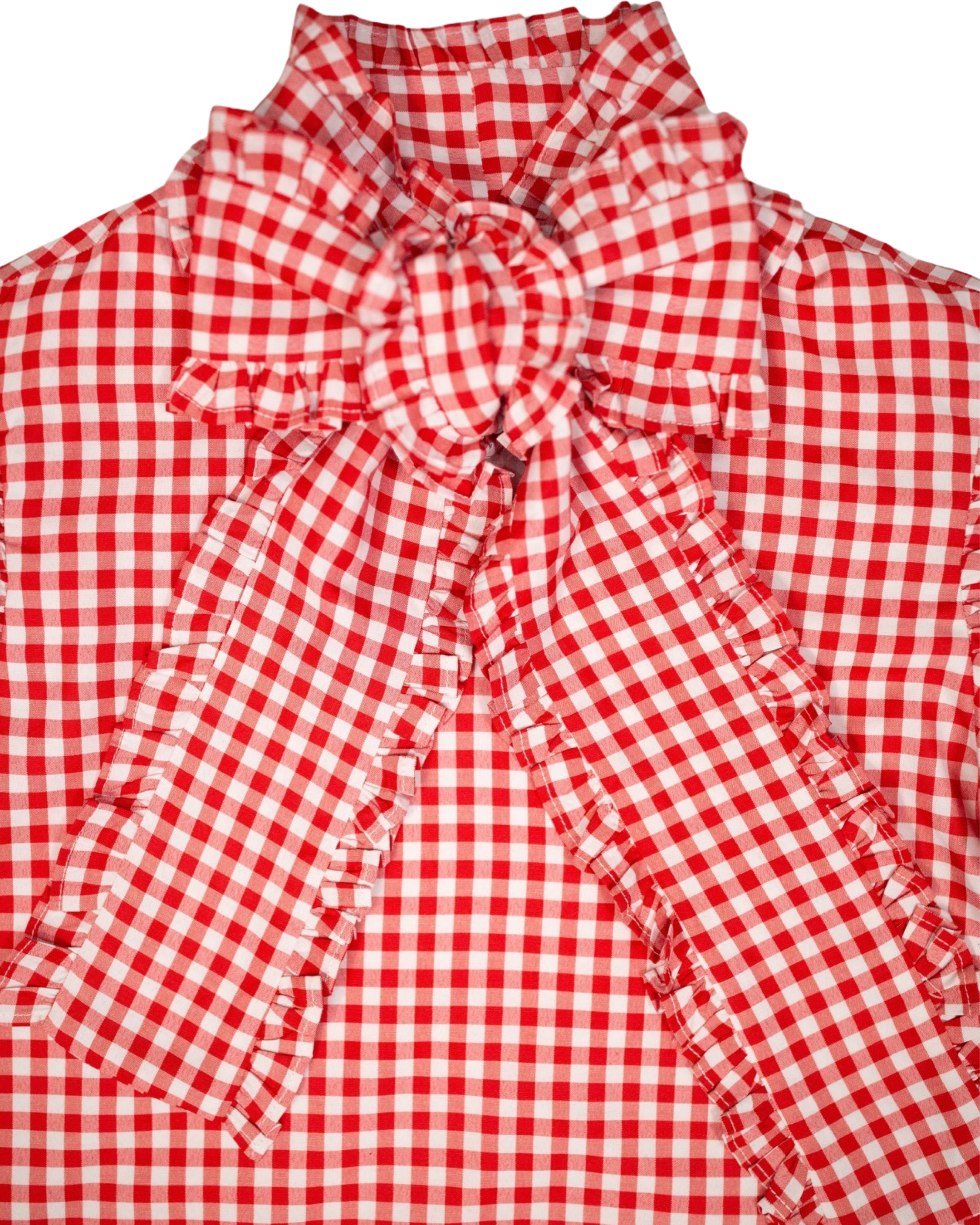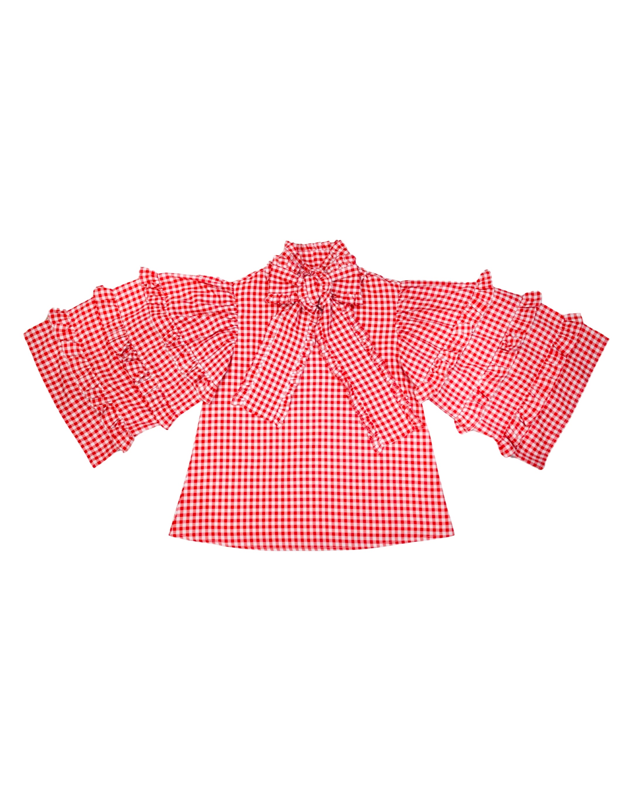 Ruffle detailing on the sleeves. Ruffled bow tie neckline.