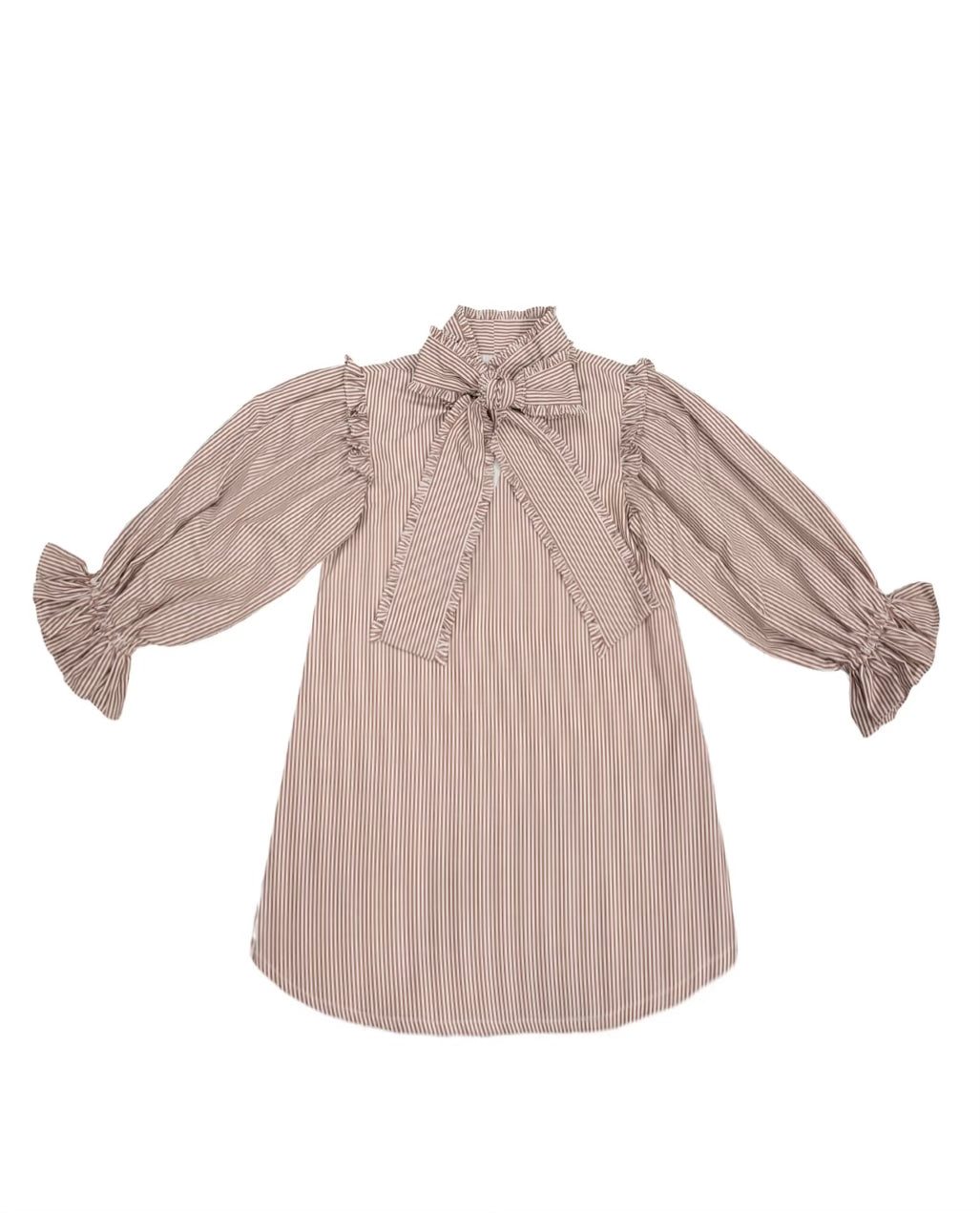Ruffled pouffy sleeves. Ruffled bow tie neckline.