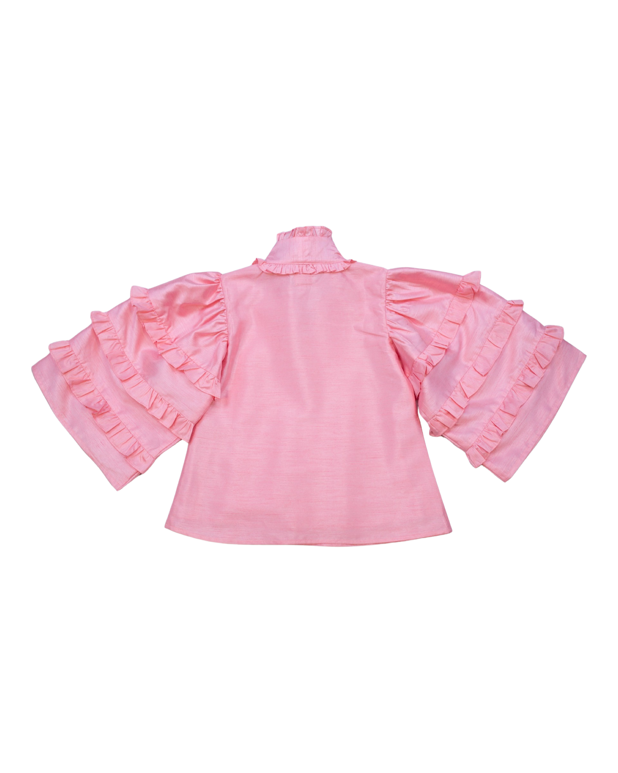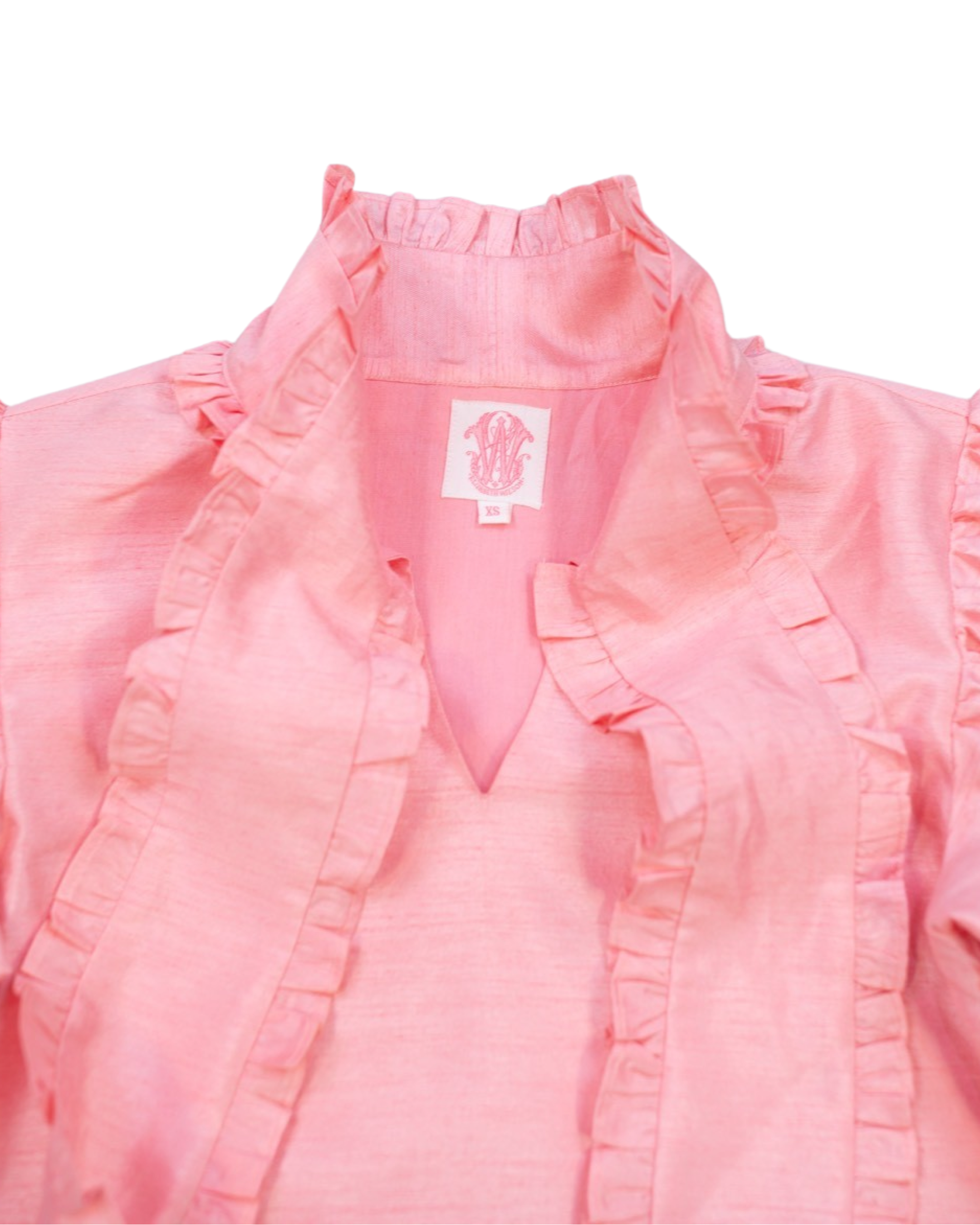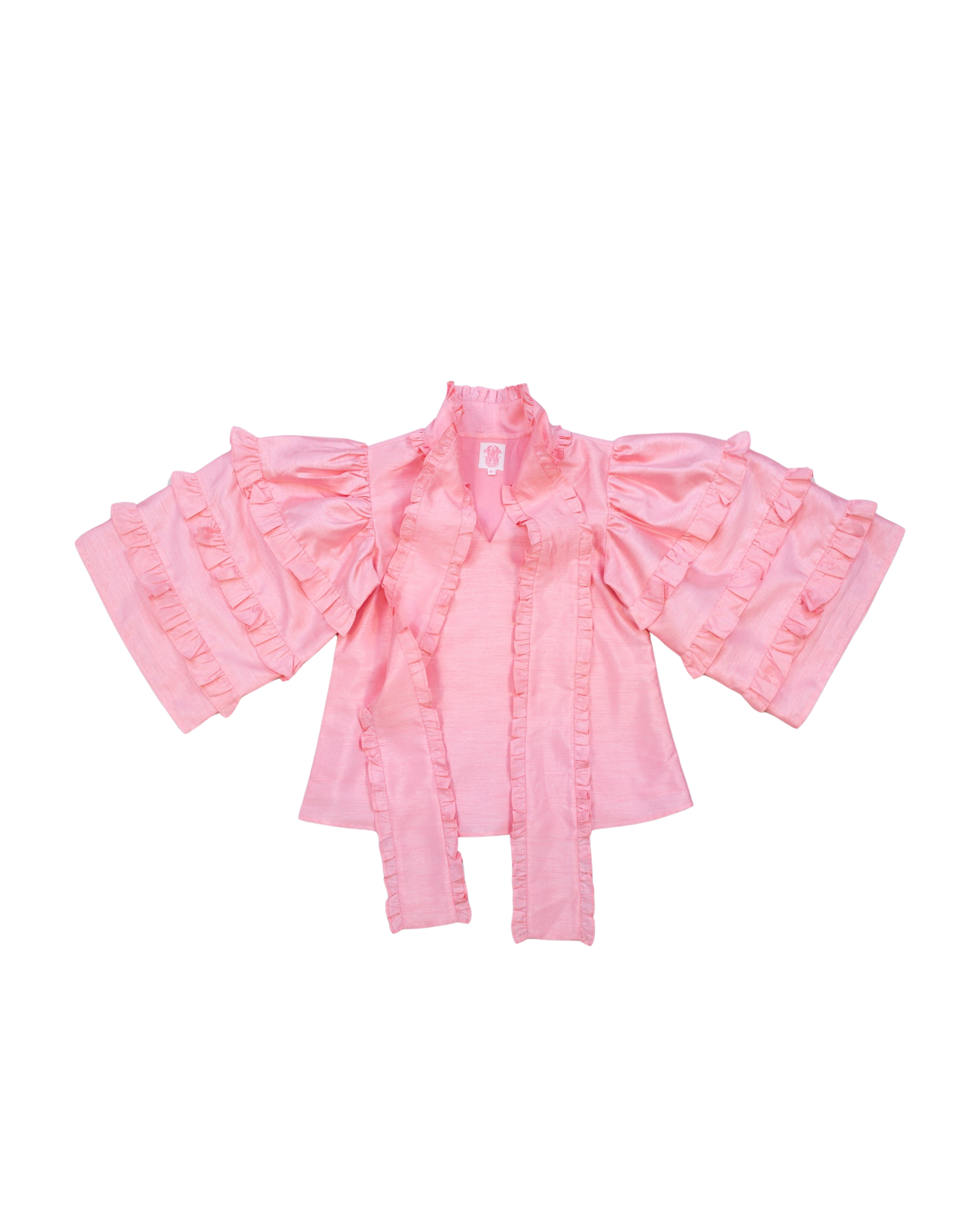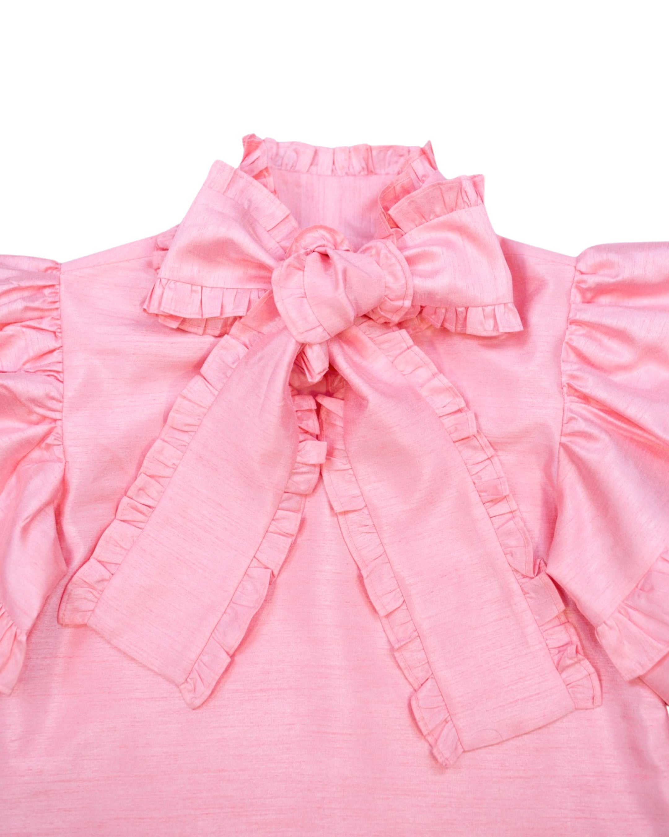 Ruffle detailing on the sleeves. Ruffled bow tie neckline.
