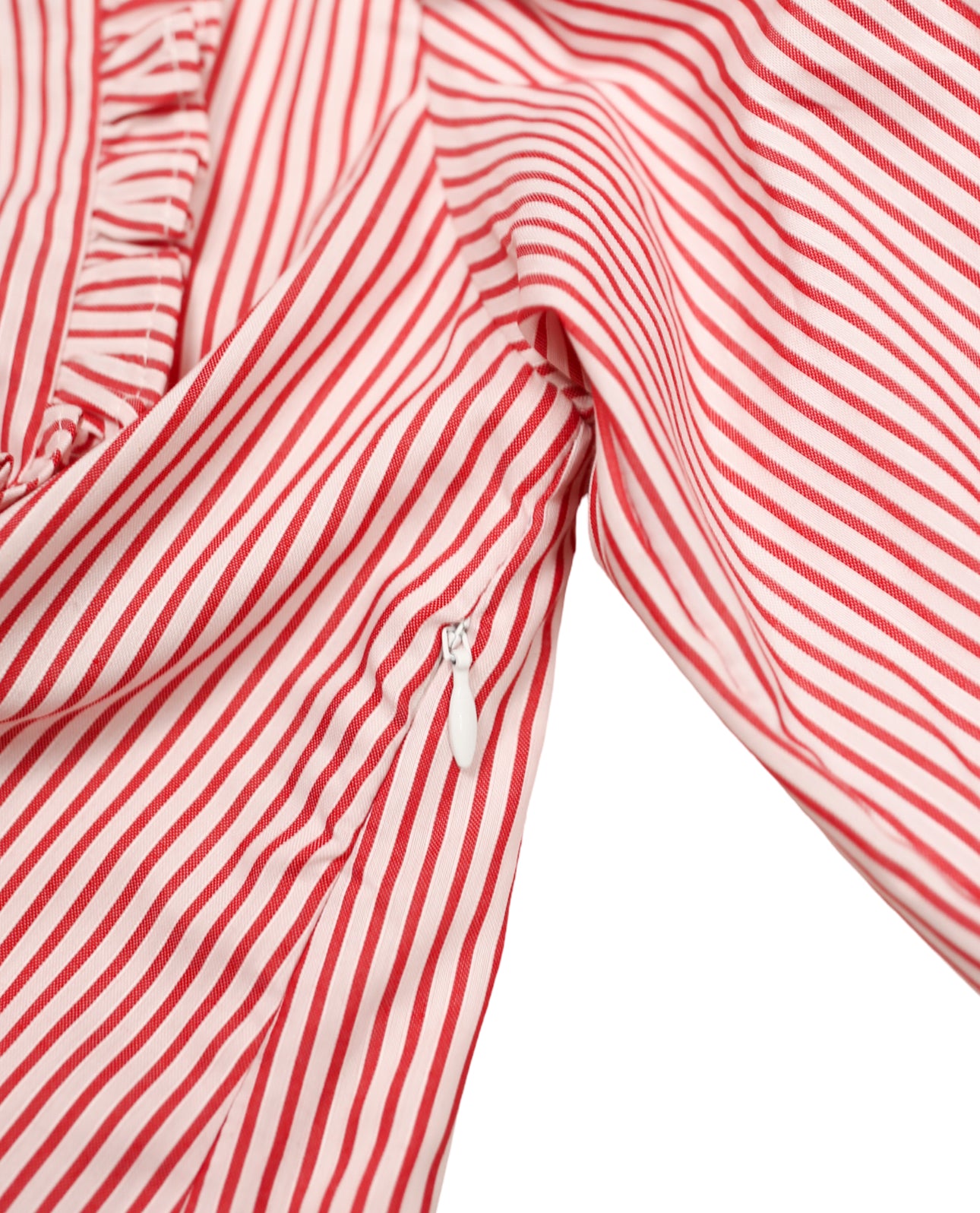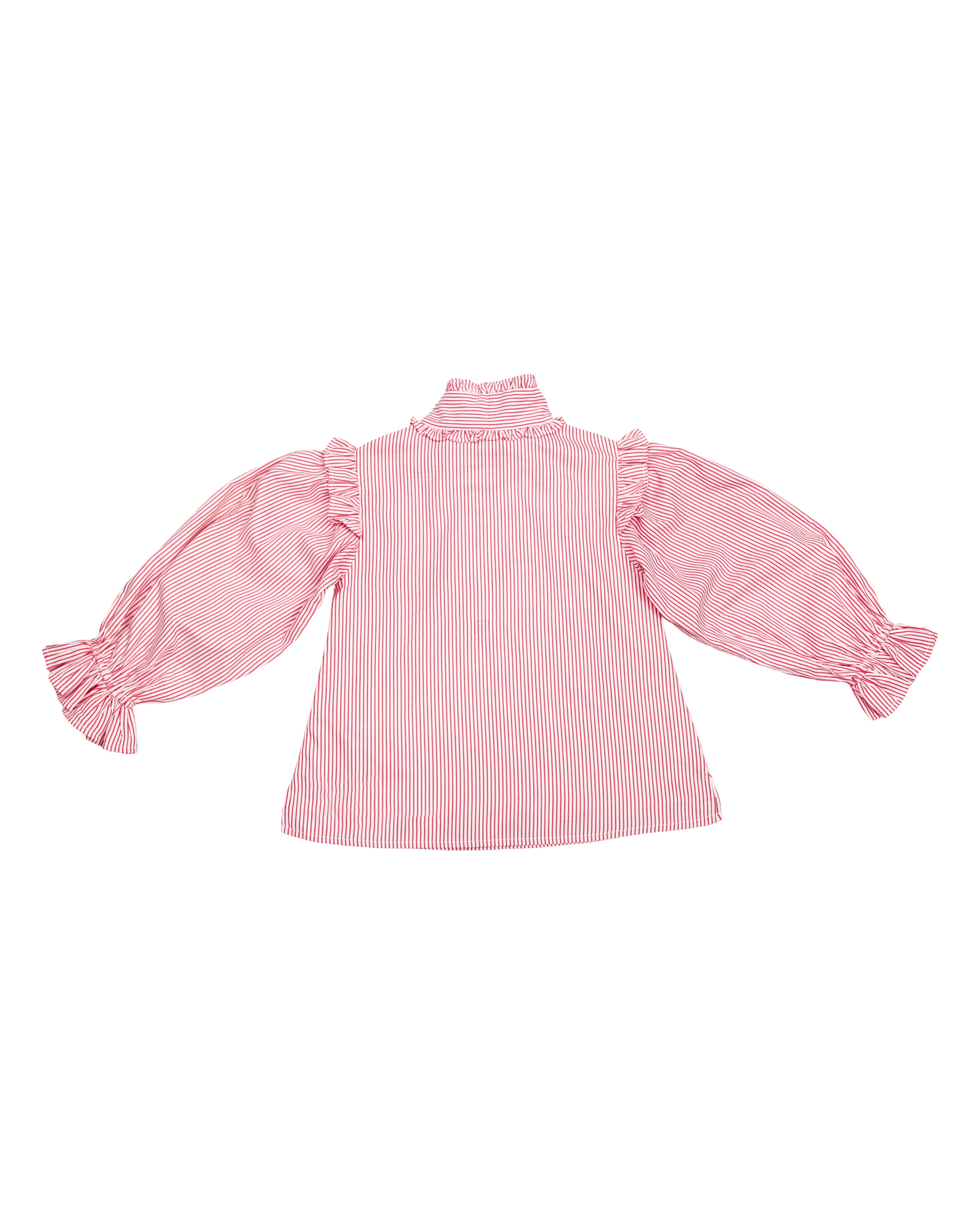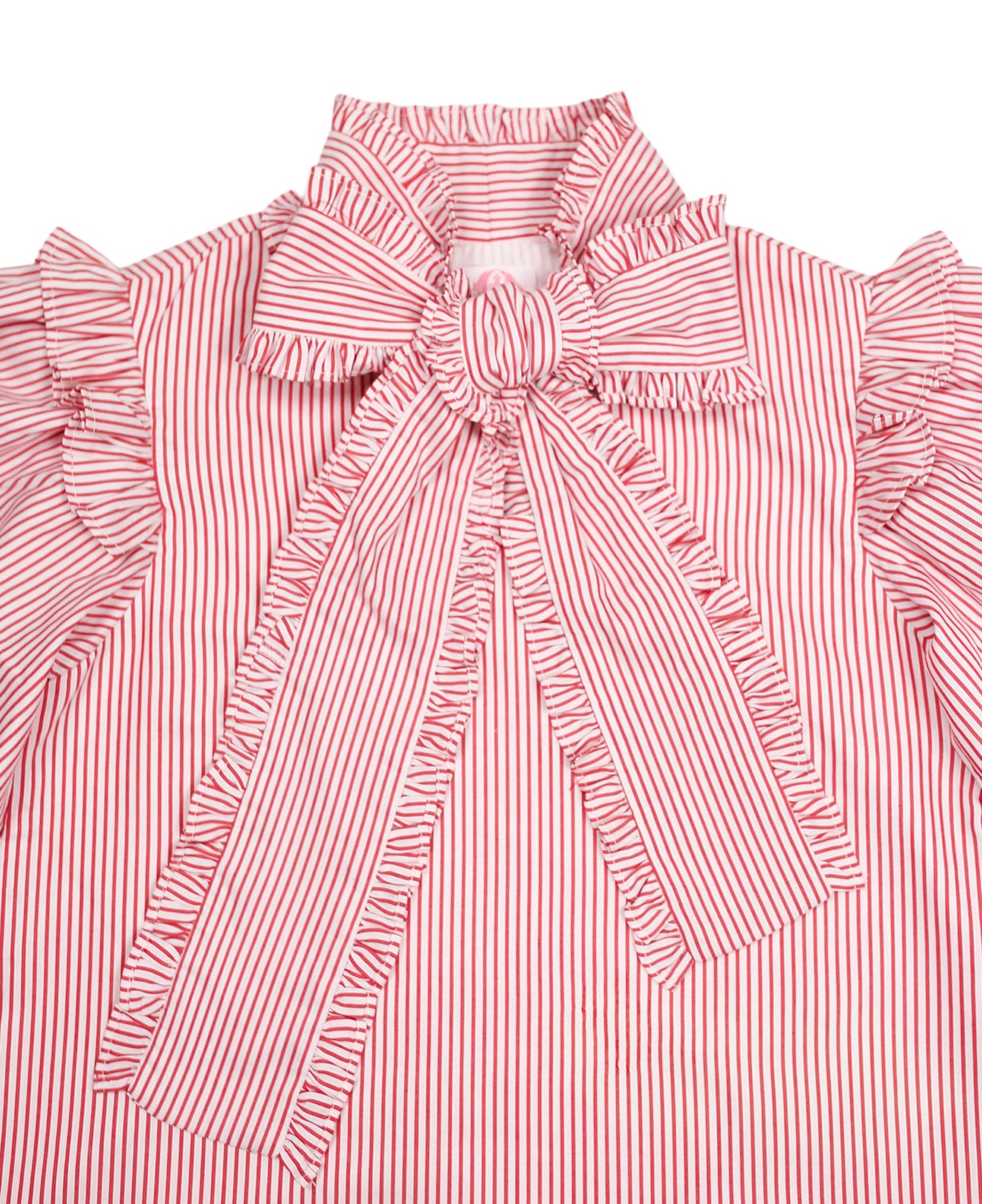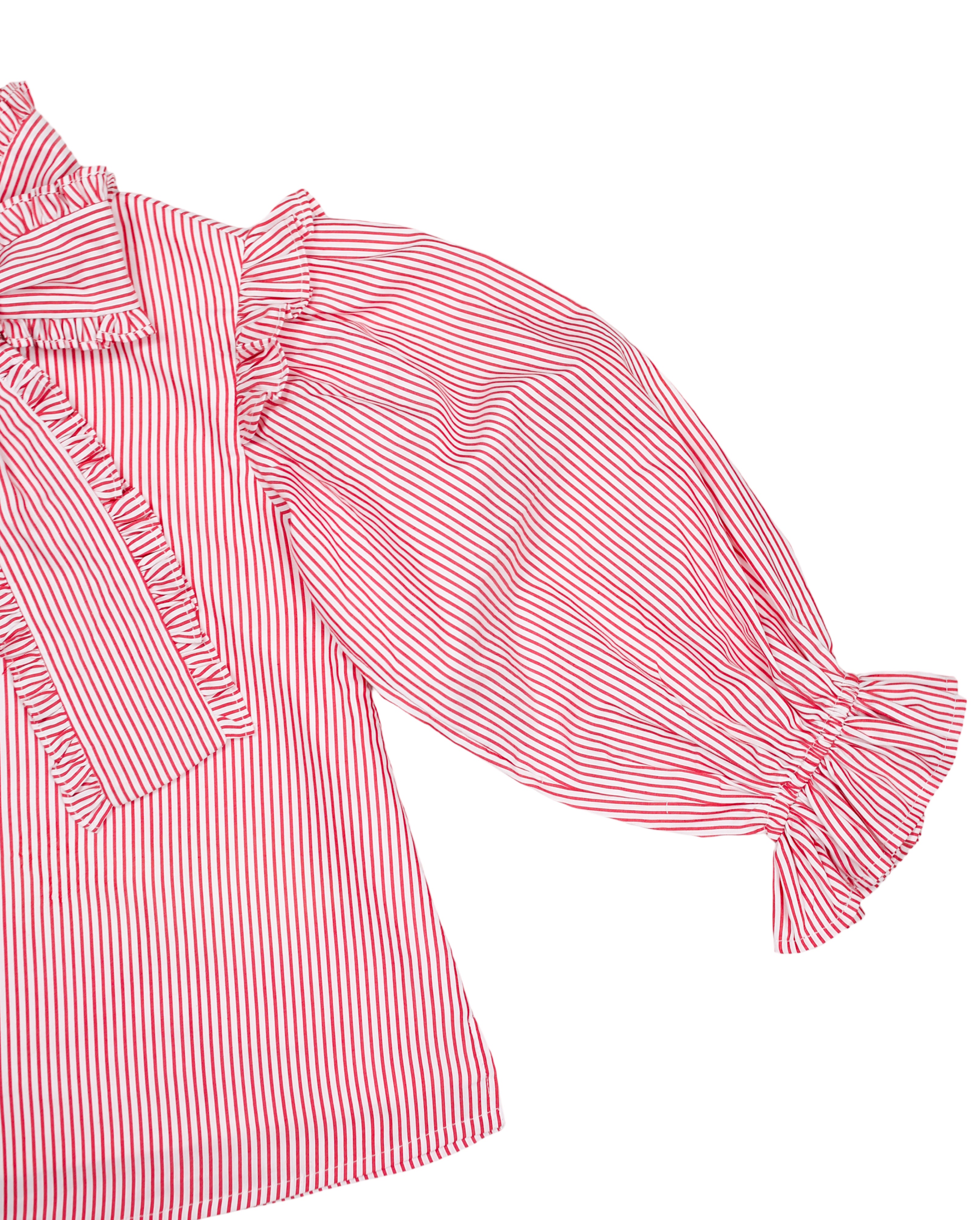 Ruffled pouffy sleeves. Ruffled bow tie neckline.