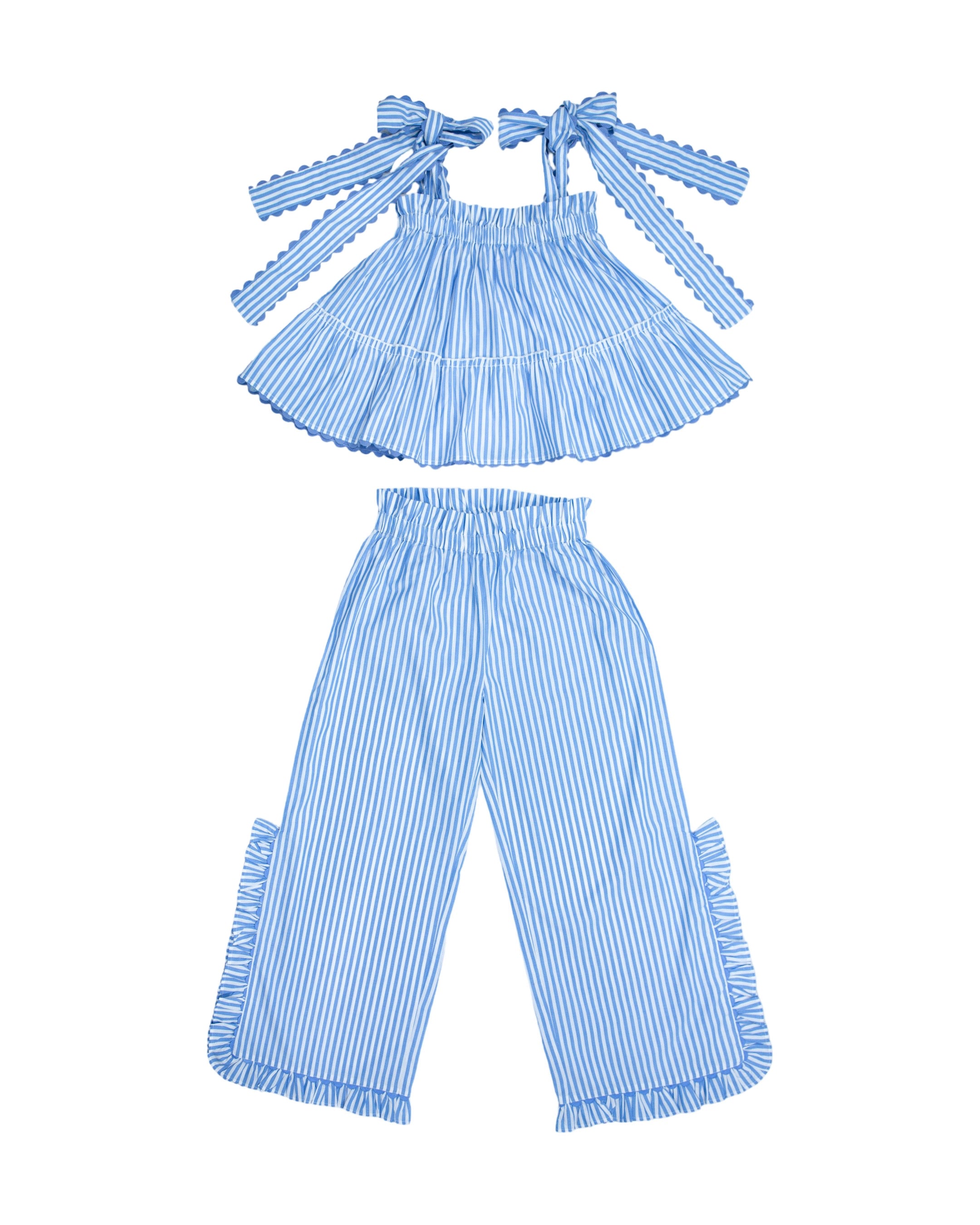 A ruffled and ric rac adorned shoulder tie top and ruffle pants with a ruffle elastic waistband and ruffle ric rac side slits.