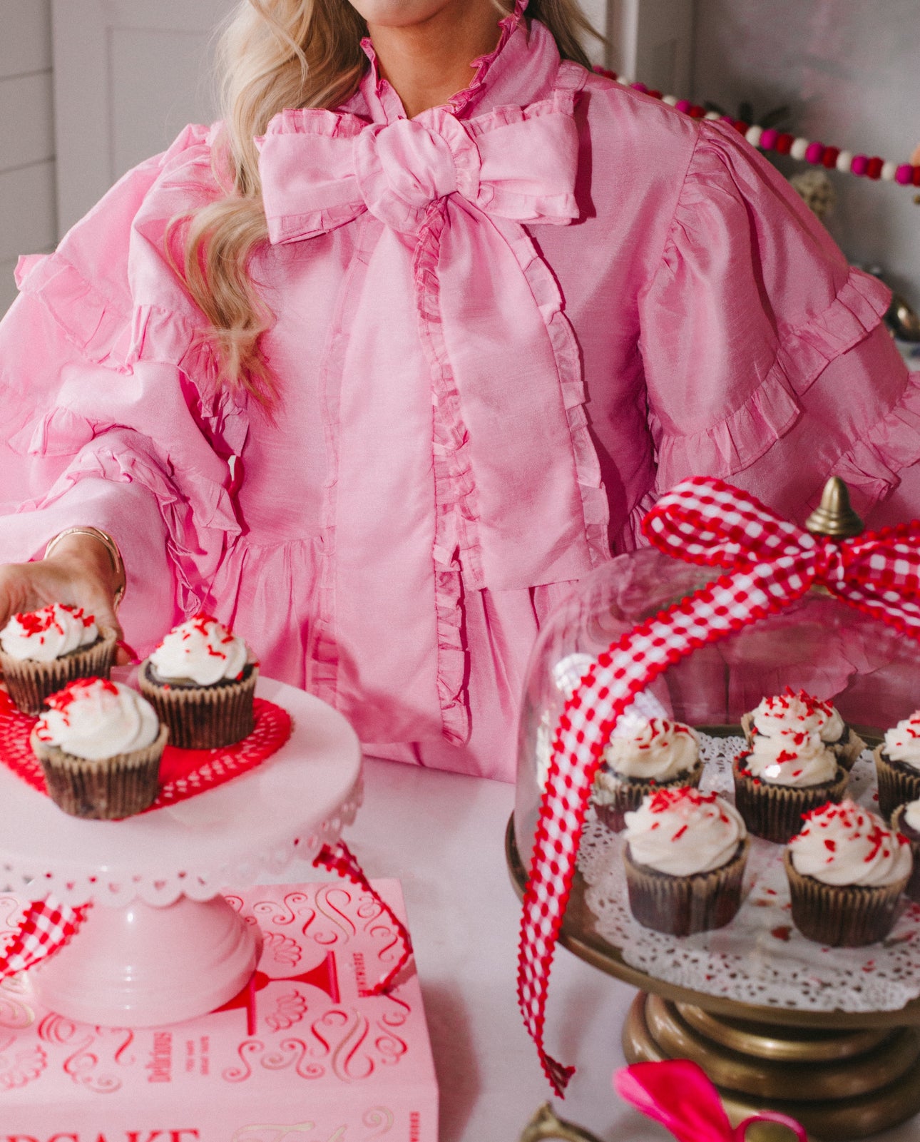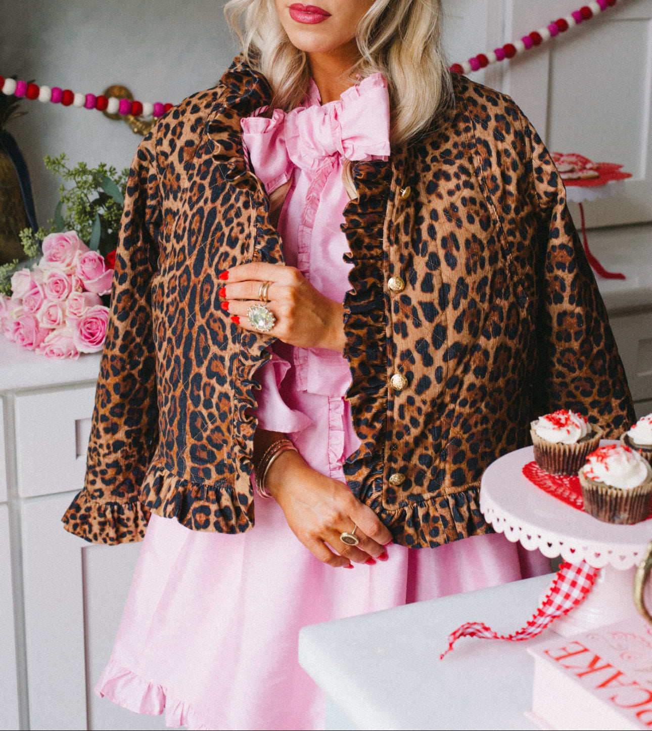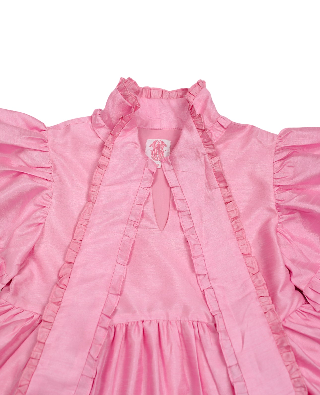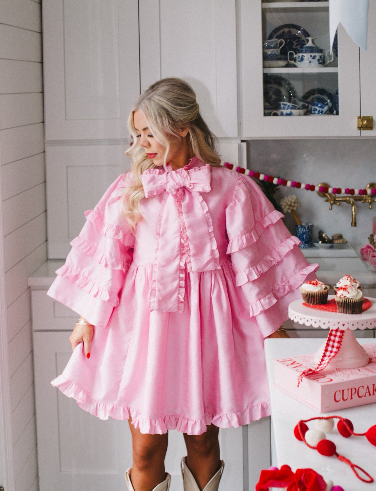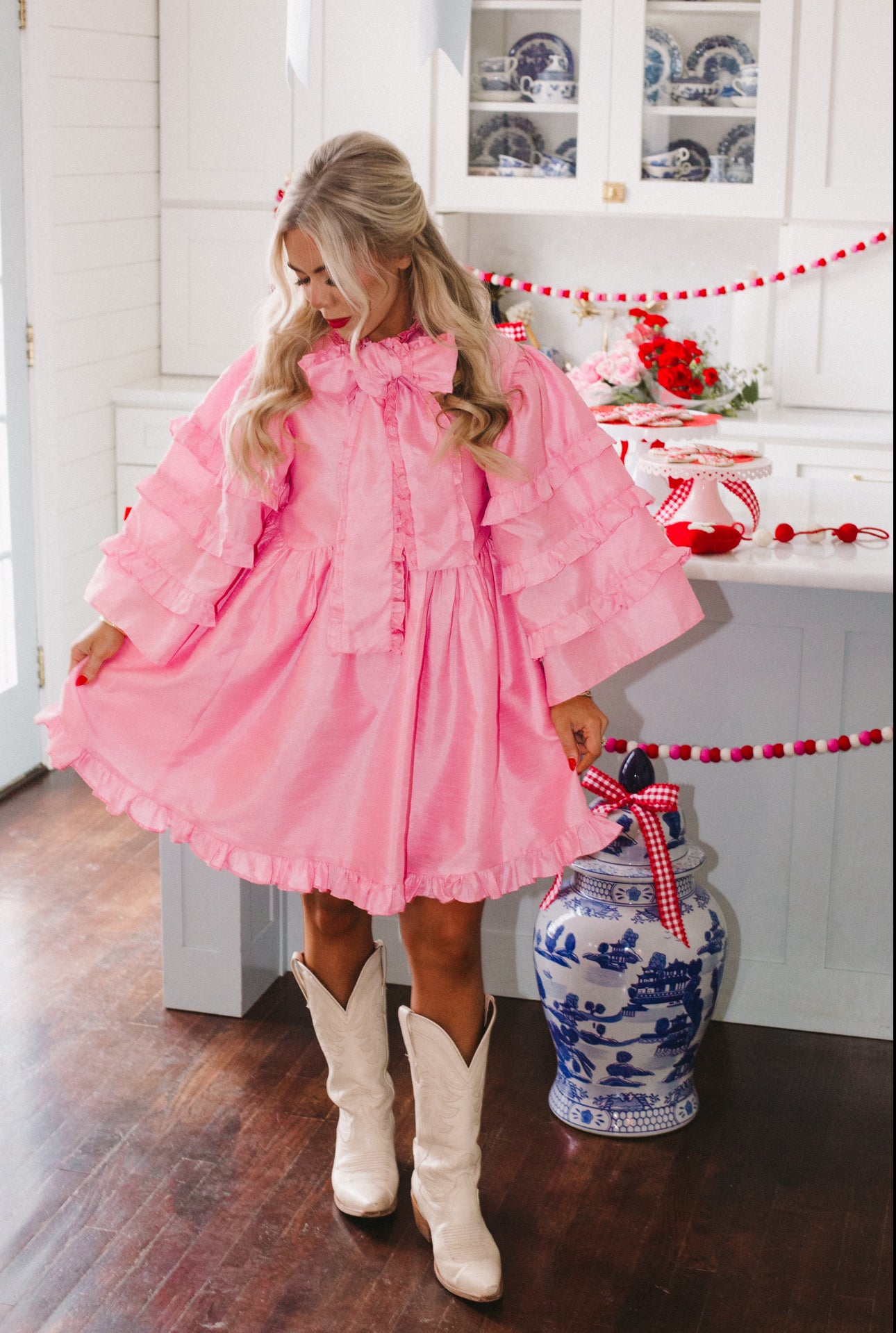 Talk about a statement piece... this dress has ruffles galore and the most perfect bow neckline! This is a dress you’ll want to twirl around in all year long! Made of a beautiful shiny candy pink textured fabric, this dress is THE perfect piece for any occasion!