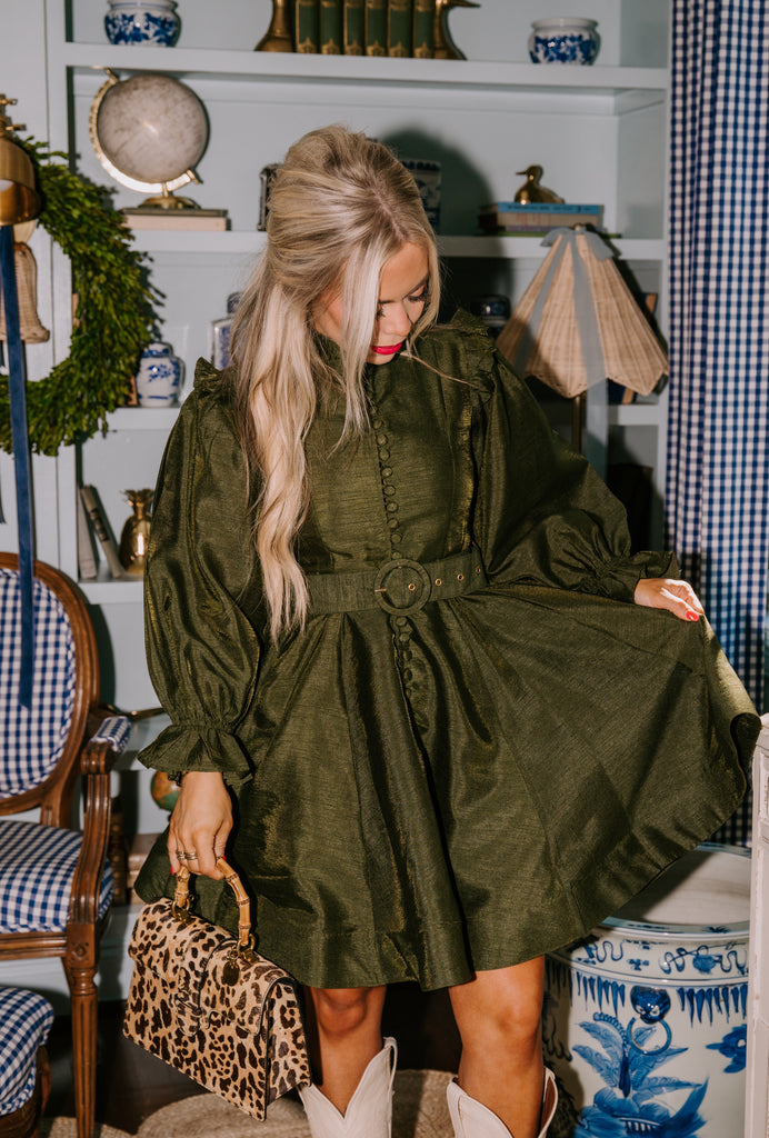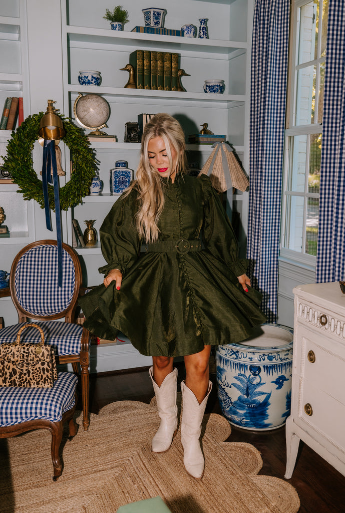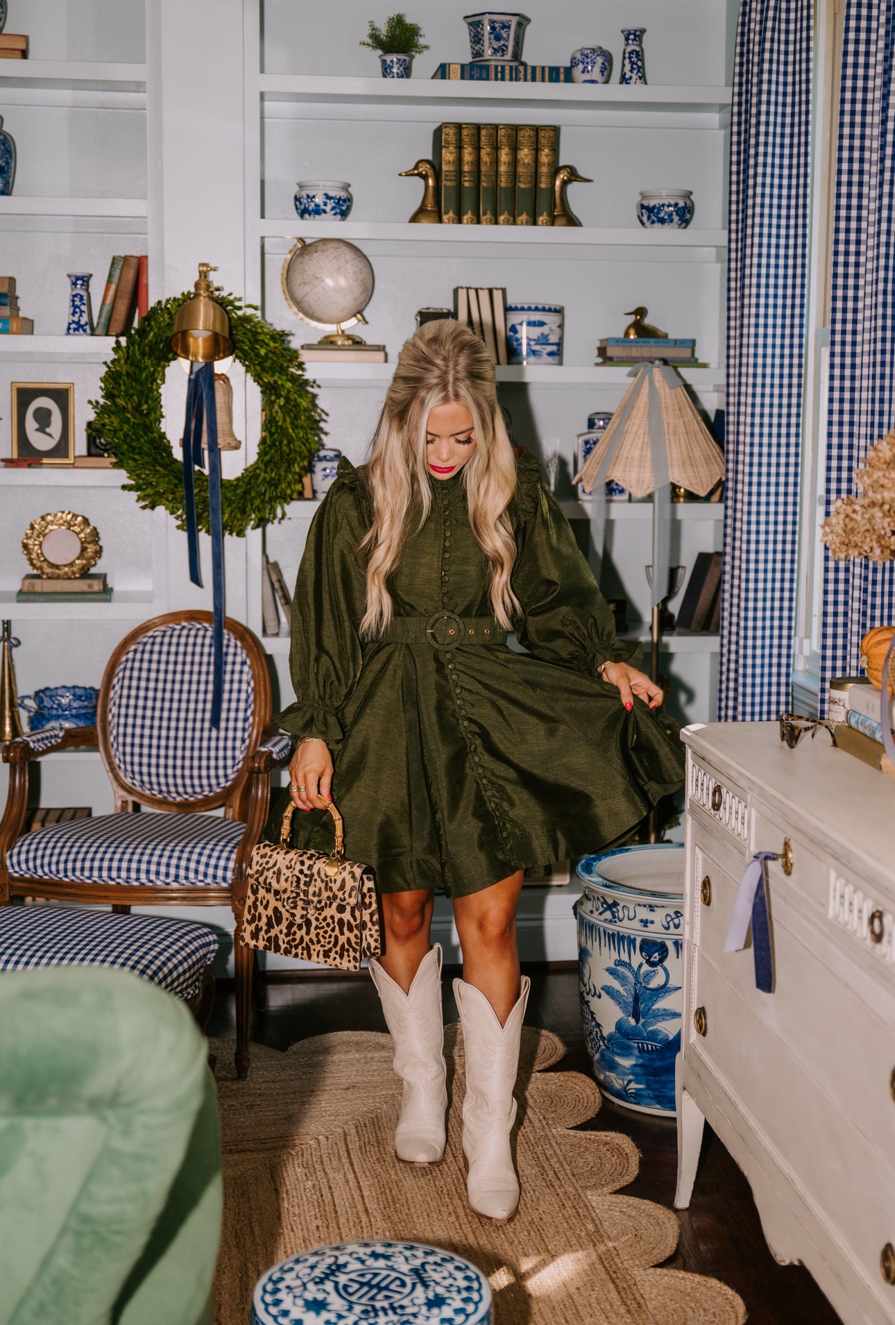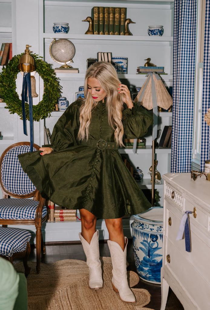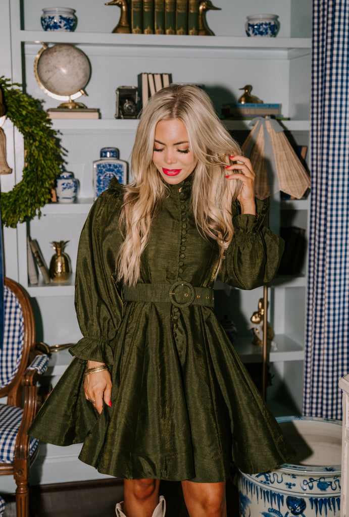 Meet the Mary Francis dress… talk about a statement piece! This dress features so many thoughtful details and such a flattering silhouette! This is a dress you’ll want to twirl around in all season long! Made of a beautiful shiny olive green textured fabric, this dress is the perfect piece for any occasion! Pair this dress with cowboy boots for a perfect southern belle look, or with heels for any special occasion!