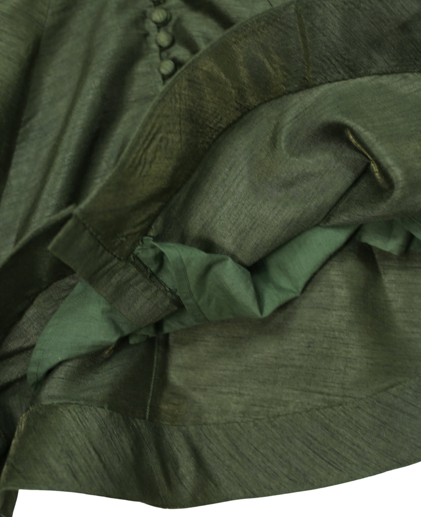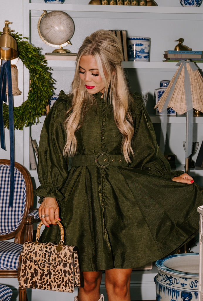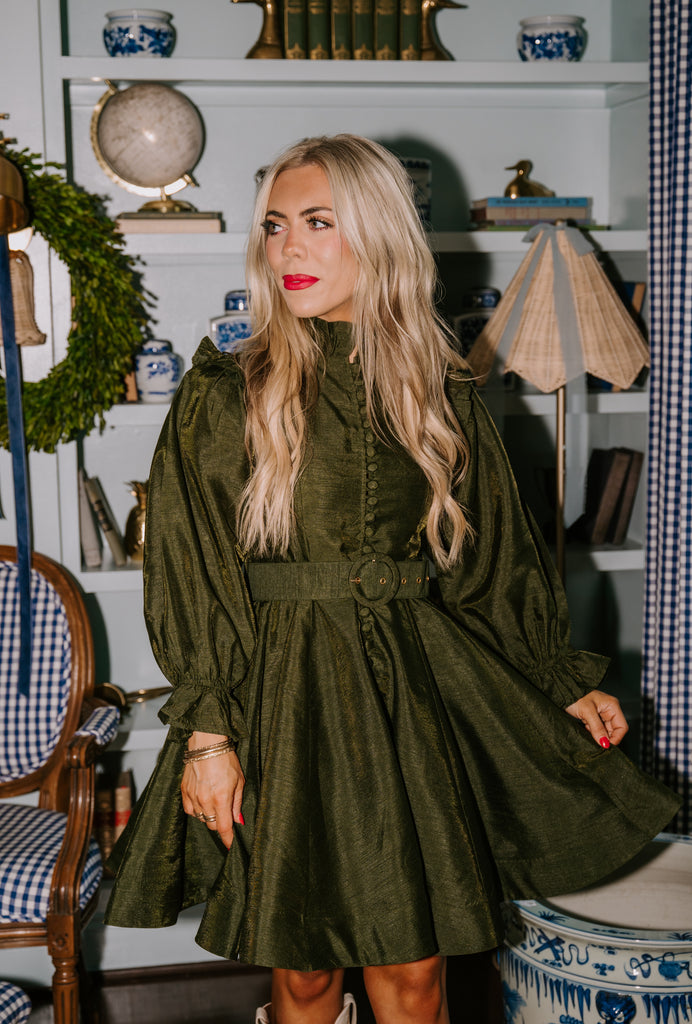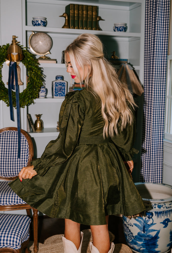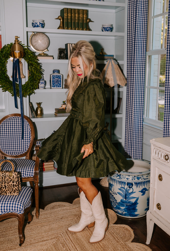 Meet the Mary Francis dress… talk about a statement piece! This dress features so many thoughtful details and such a flattering silhouette! This is a dress you’ll want to twirl around in all season long! Made of a beautiful shiny olive green textured fabric, this dress is the perfect piece for any occasion! Pair this dress with cowboy boots for a perfect southern belle look, or with heels for any special occasion!