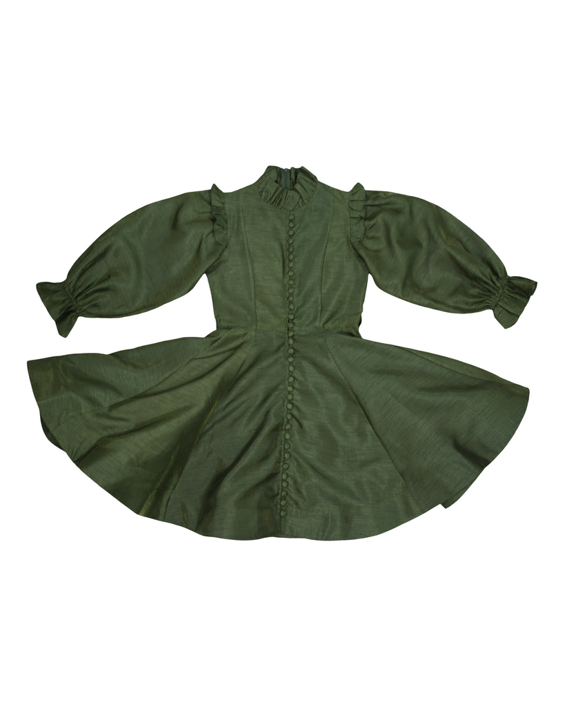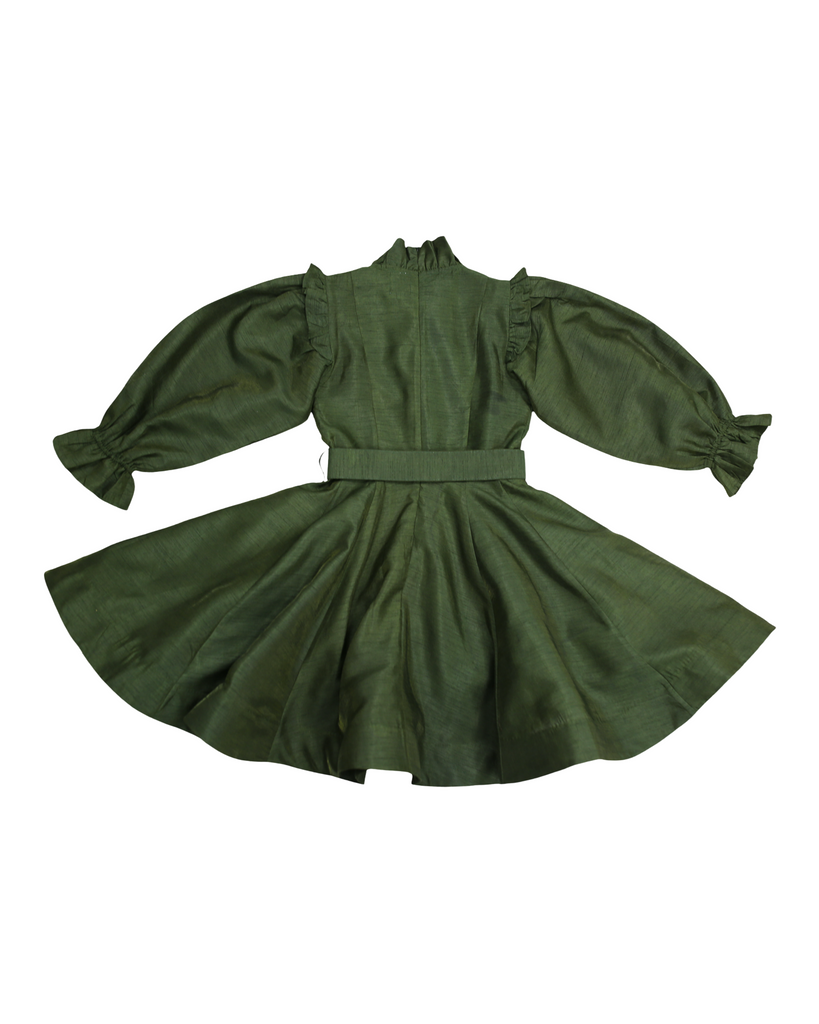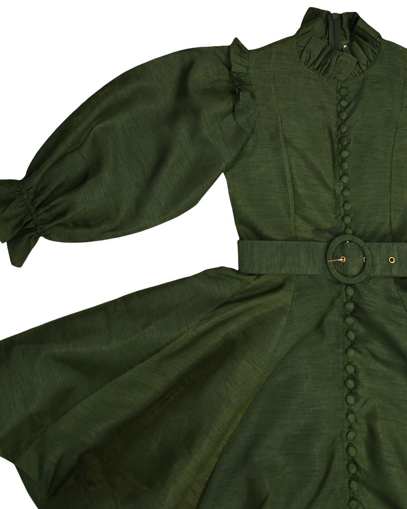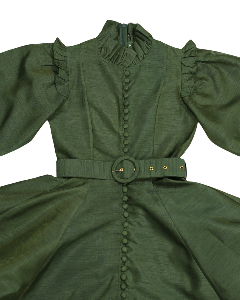 A knee-length dress with ruffle detailing around the neckline, ruffled pouf sleeves with elastic at the wrists, fabric-covered buttons, pockets, a removable belt, and a full skirt with facing at the hem for structure.