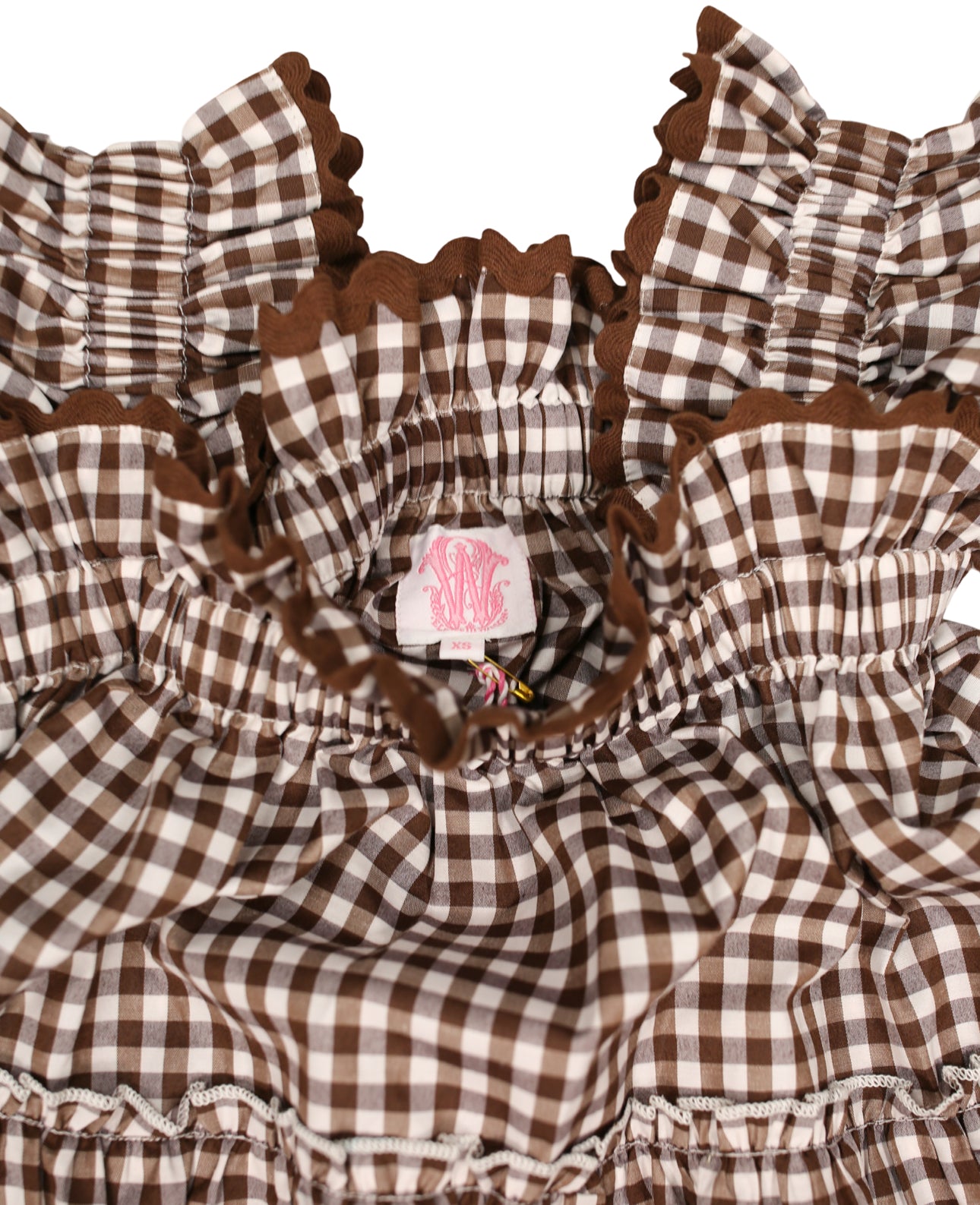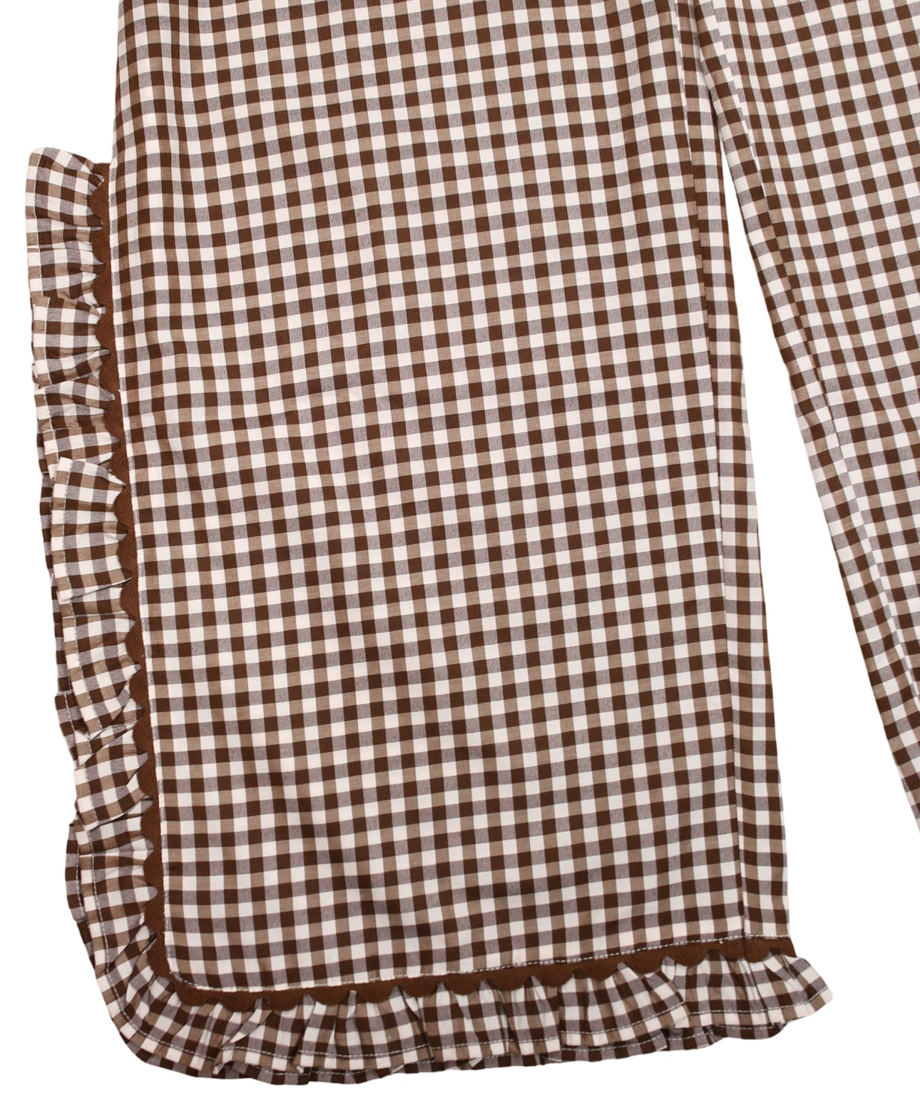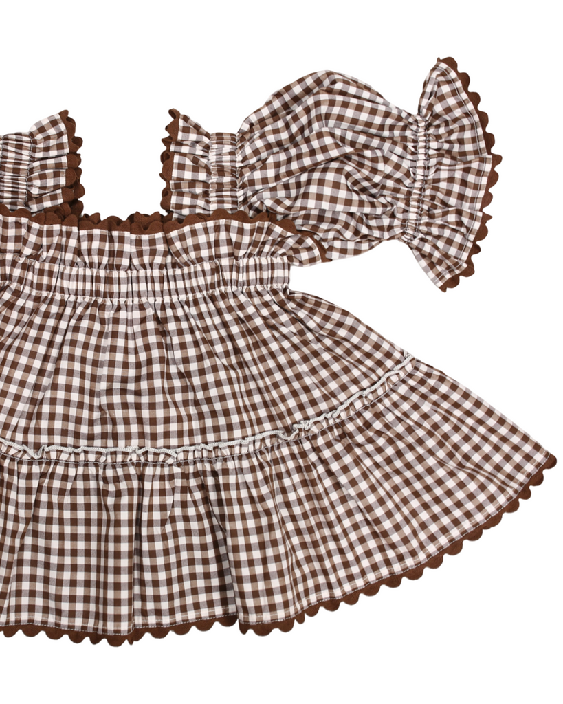 Chocolate brown and white woven gingham. Chocolate brown ric rac trim.