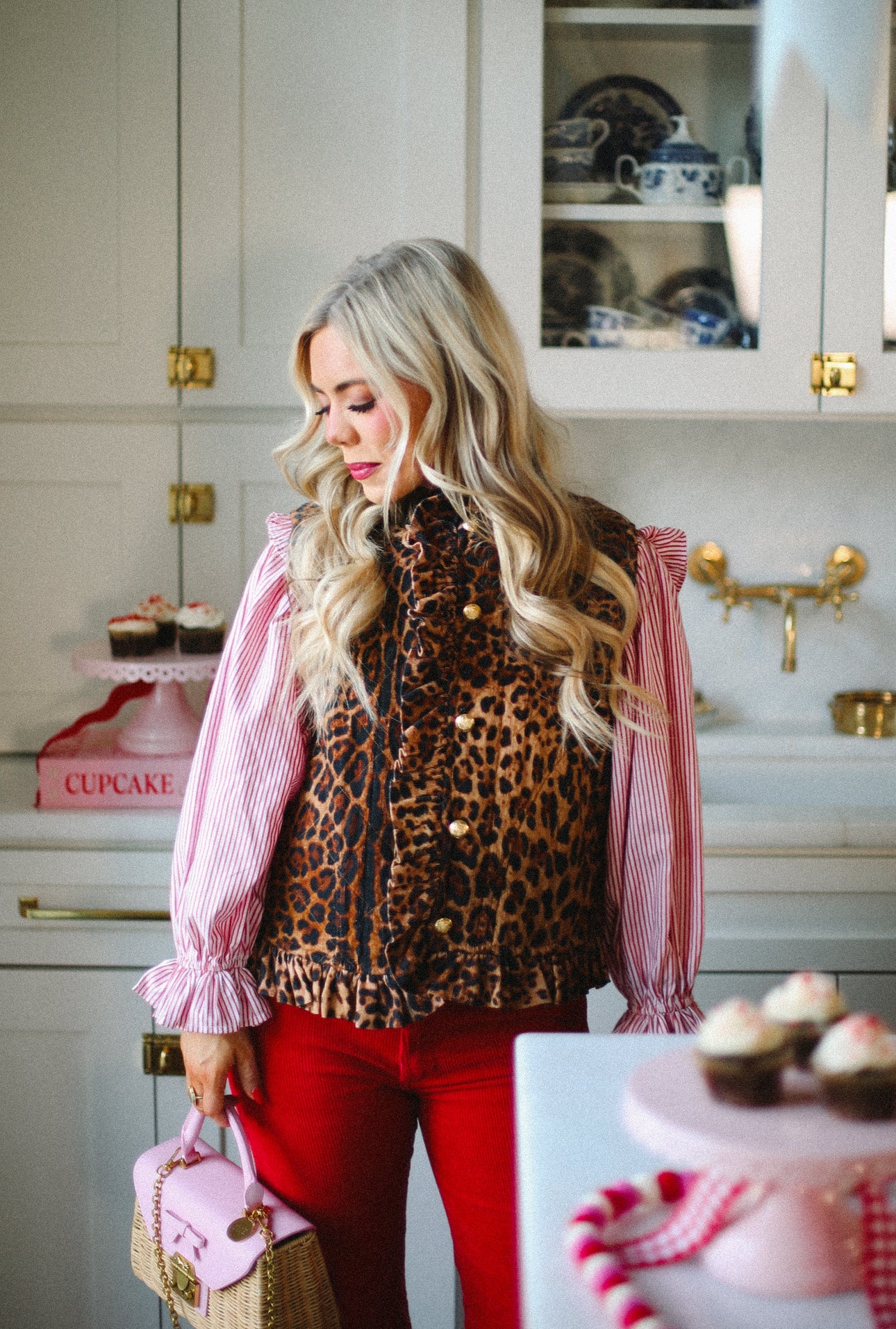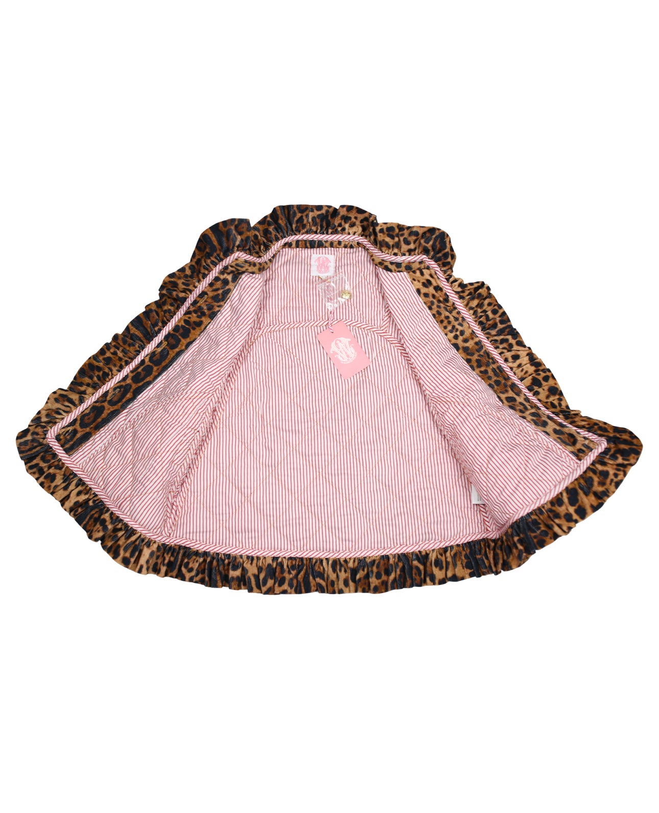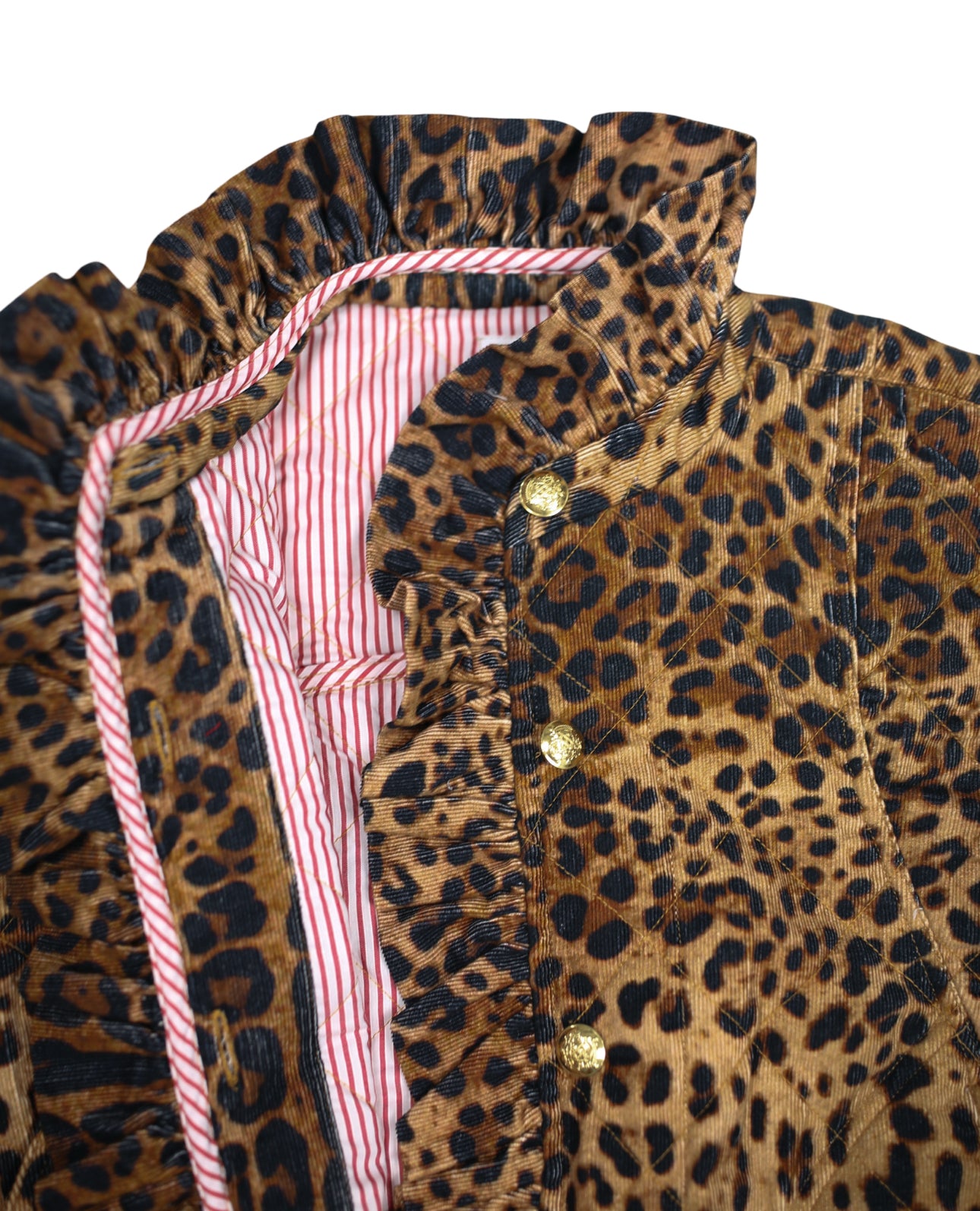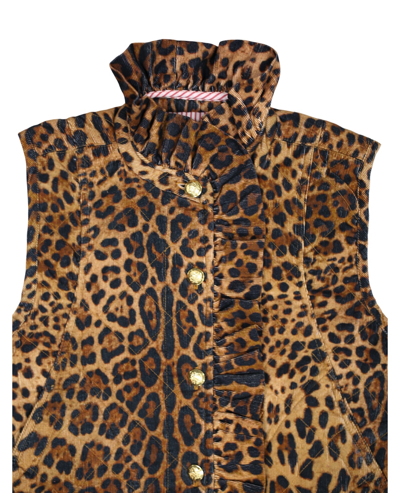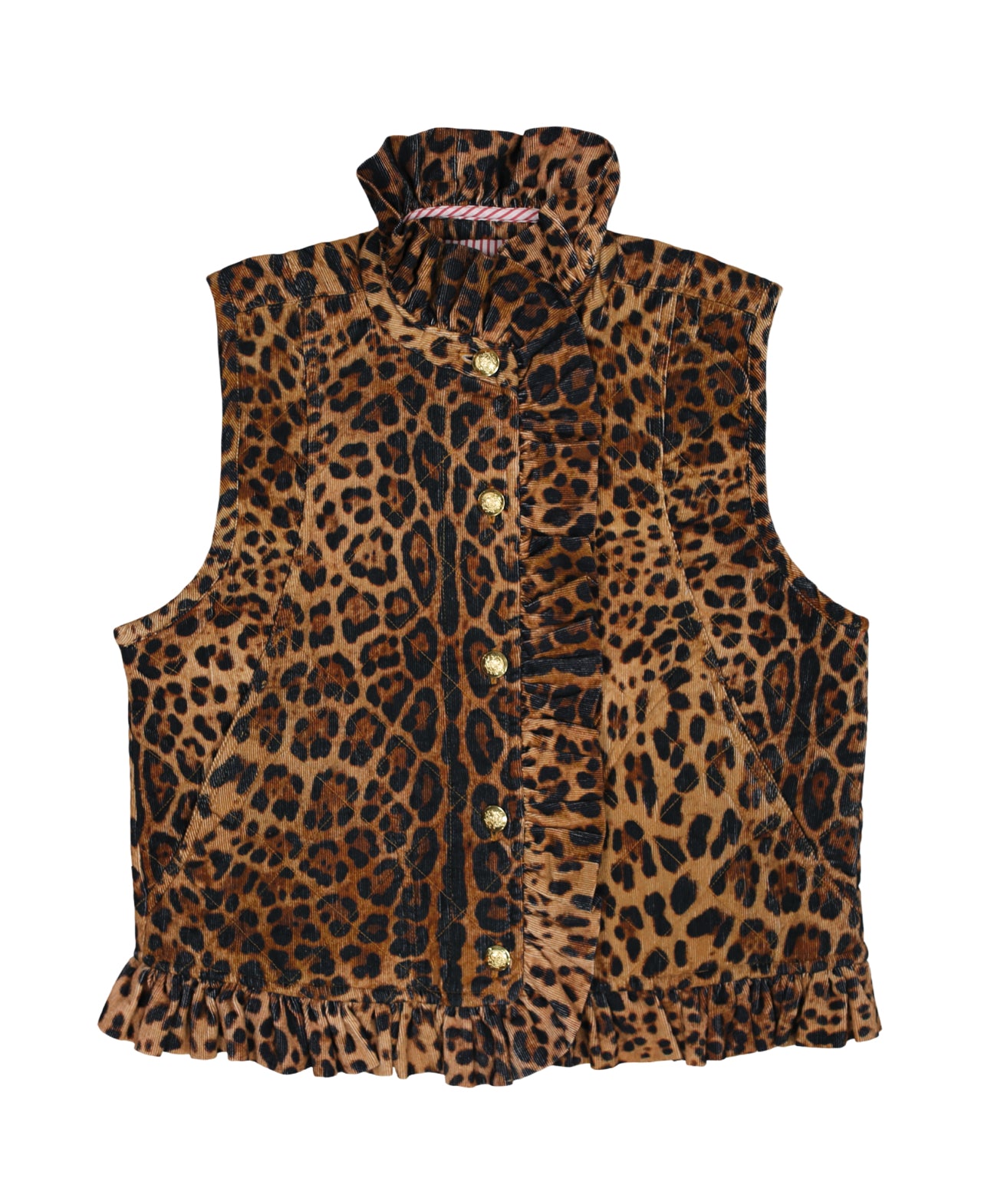 Leopard corduroy, ruffle detailing, stripe lining, and brass buttons? Yes please! Bringing back our best-selling vest design, the Vivienne vest, now in lespadrilles corduory! This ruffled number is super cozy and comfortable, and is the ideal statement piece to layer over all of your favorite EWD tops! Featuring quilted corduroy fabric, beautiful brass buttons and side pockets!